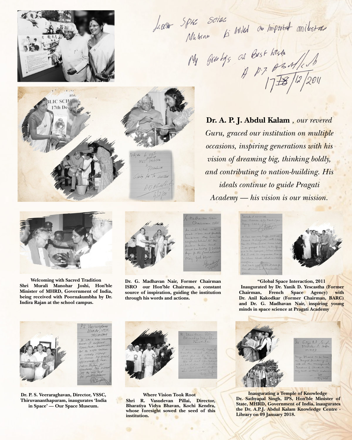 Pragati Academy, formerly MET Public School, was established in 1991 and later renamed on the advice of Dr. A.P.J. Abdul Kalam, the visionary scientist and 11th President of India. A perennial source of inspiration, Dr. Kalam's dedication to education, innovation, and nation-building continues to guide us.