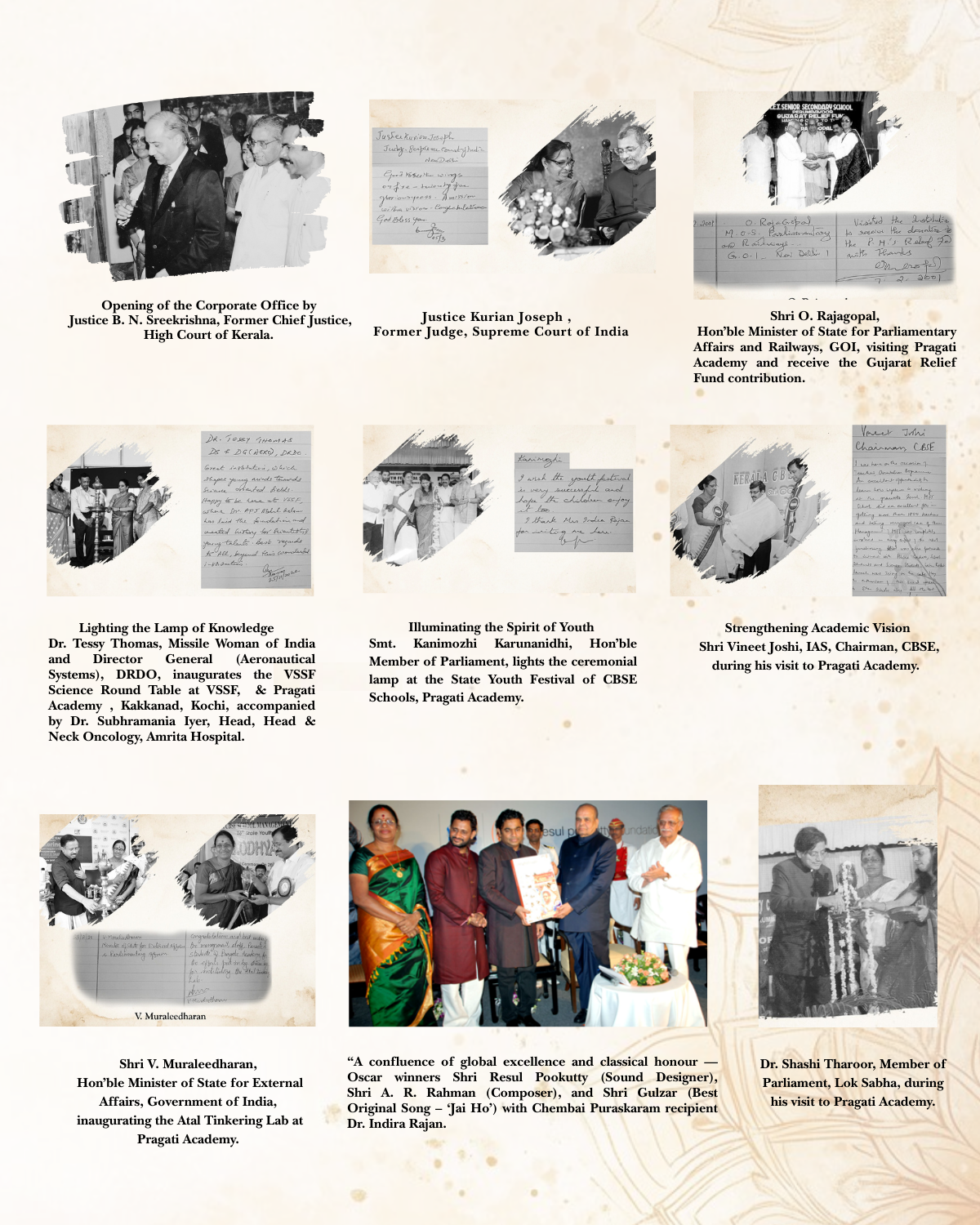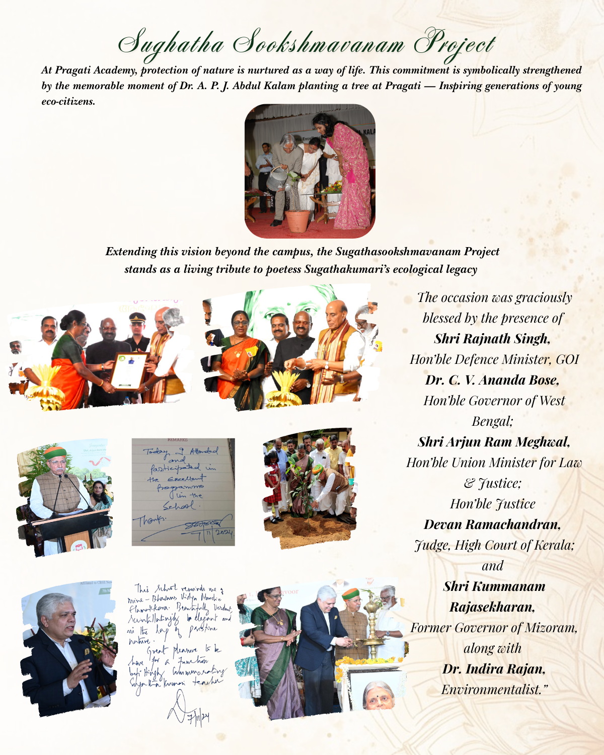 The official launch of the ISRO Space Tutor Programme took place on April 4, 2024, with His Excellency Shri Arif Mohammed Khan, Hon'ble Governor, presiding over the event. The occasion was further enriched by the esteemed presence of Dr. G. Madhavan Nair, Former Chairman of ISRO, Shri S. Unnikrishnan Nair, Director of VSSC, Trivandrum, Dr. V. P. Joy IAS, Former Chief Secretary, Dr. Indira Rajan, Managing Director, and Ms. Suchitra Shyjinth, Principal of Pragati Academy.